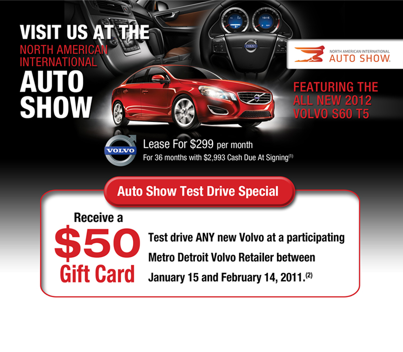 (1) No security deposit required. Monthly payment of $299, based on $31,850 MSRP of 2012 S60 T5, includes destination charge. Lessee is responsible for excess wear and mileage over 10,000 miles/year at $0.18 / mile. Take new retail delivery from retailer stock between January 4, 2011 and February 28, 2011. Please visit www.volvocars.com/us/safeandsecure or your local Volvo retailer for details on the Volvo Safe + Secure Coverage Plan and for further details specific to leased vehicles. Car shown with optional equipment. Advertised lease payment and financing excludes taxes, title, and regis. fees and are available for qualified customers through U.S. Bank. Payments may vary, as retailer determines price. Offers available at participating retailers excluding Alaska. See retailer or website for details. (2) Offer good thru 2-14-2011 or while supplies last. Residency restrictions apply. Must be 18 years of age or older and a licensed driver. Only One “1” $50 gift card redemption per licensed driver. See your participating Metro Detroit Volvo Retailer for complete details. Visit any participating Metro Detroit Volvo Retailer from 1-15-2011 thru 2-14-2011. Test drive any new Volvo vehicle. Complete the redemption certificate and submission instructions to receive the $50 gift card of your choice. The redemption certificate must be postmarked by Monday, 02-21-2011 to qualify. All gift cards will be processed within 6 to 8 weeks of submission. Visit volvotestdrive.com/det1 for more details. Golfsmith®, Starbucks® and Bed Bath & Beyond® are not a program sponsor. Volvo is a registered trademark of Volvo Cars of North America, LLC.